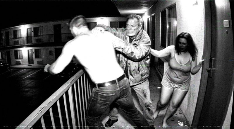 - 2:22:15 AM: An unidentified man in an oversized security windbreaker—later identified as the motel’s 65-year-old night manager—is seen colliding heavily with Jason directly at the edge of the railing.