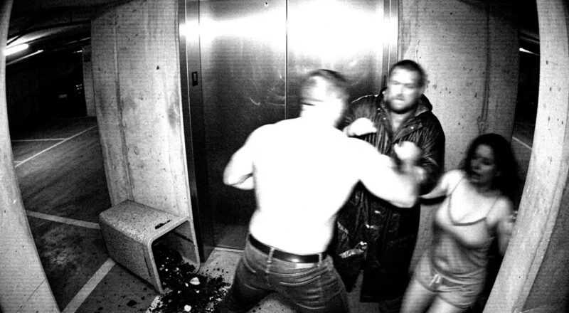 The heavily corrupted, grainy black-and-white video footage shows a heavily muscular, shirtless man locked in a desperate, clumsy collision with an unidentified intruder wearing a drenched industrial raincoat. Just inches behind him, a terrified woman can be seen violently pulling on the man’s shoulder, visibly recoiling backward across the concrete floor in a state of absolute, unvarnished panic.
