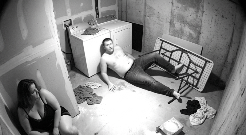 The heavily corrupted, grainy black-and-white video footage shows a heavily muscular, shirtless man falling flat on his back on the concrete floor, his legs tangled in a folding table as he scrambles away from the household laundry machines. Just inches away in the foreground, a terrified woman can be seen huddled awkwardly into the corner of the room, visibly frozen in a state of absolute, unvarnished panic as she clutches an empty laundry basket.