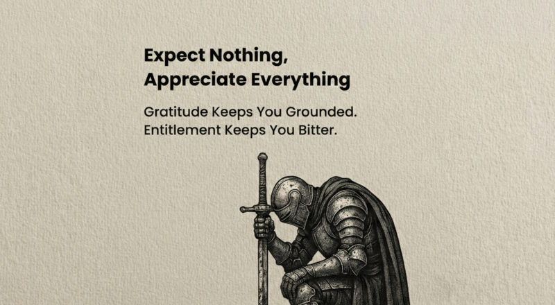 The image of the kneeling knight offers a powerful counter-narrative. It presents a philosophy as old as the stones but as fresh as the morning news: Stoicism. The text reads, “Expect Nothing, Appreciate Everything. Gratitude Keeps You Grounded. Entitlement Keeps You Bitter.”