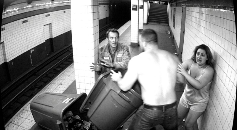 The heavily corrupted, grainy black-and-white video footage shows a muscular, shirtless man locked in a desperate, clumsy struggle on the platform. He is frantically shoving a heavy industrial trash bin against an unidentified man wearing a dirty uniform. Behind him, a terrified woman can be seen stumbling backward, visibly frozen in a state of absolute, unvarnished panic.
