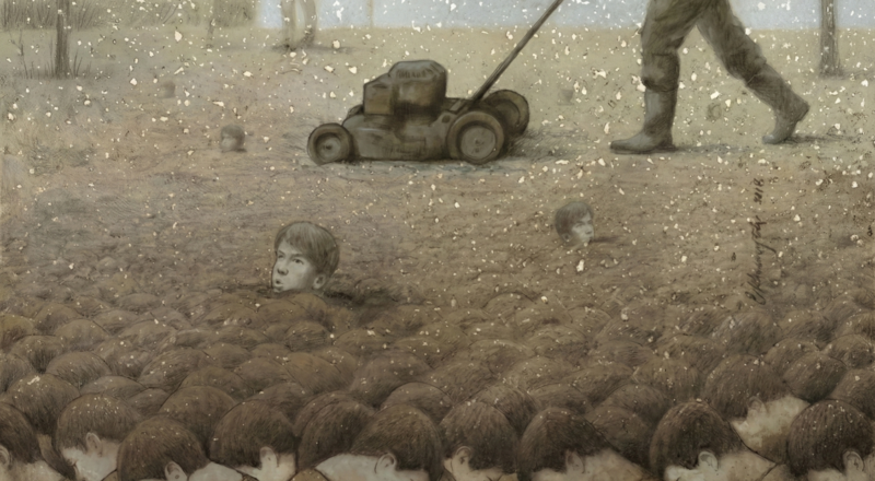 Above him looms the threat: a massive lawnmower pushed by a faceless giant. The machine is set to the height of the bowed heads. The logic is terrifyingly mechanical—if you keep your head down, the blade passes over you harmlessly. If you dare to stand up, you will be cut.