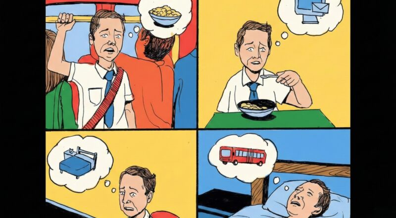 - The Grind: In the third panel, he is doing the work. But he isn’t focused or productive. He is exhausted, dreaming of his bed. “If I can just finish this shift,” he tells himself, “I can finally sleep.”