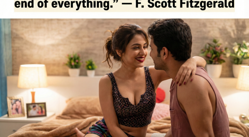 The setting is significant. The bedroom is the most private space in a home. It is where we start our day and where we end it. By placing the couple here, seated casually on the bed, the image suggests vulnerability. There are no barriers, no public personas, and no distractions. The soft, warm lighting from the lamp creates a “halo” effect, physically separating them from the rest of the world.